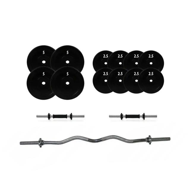 Представляємо набір навантажень з загальною вагою 45 кг. За допомогою цього набору Ви зможете повноцінно займатися зі штангою і гантелями як і в спортзалі так і в домашніх умовах. Диски підходять до w-образного грифу і до гантельних грифів тому набір вважається універсальним. Ви зможете чергувати заняття зі штангою і гантелями, тим самим рівномірно опрацьовувати різні групи м'язів.